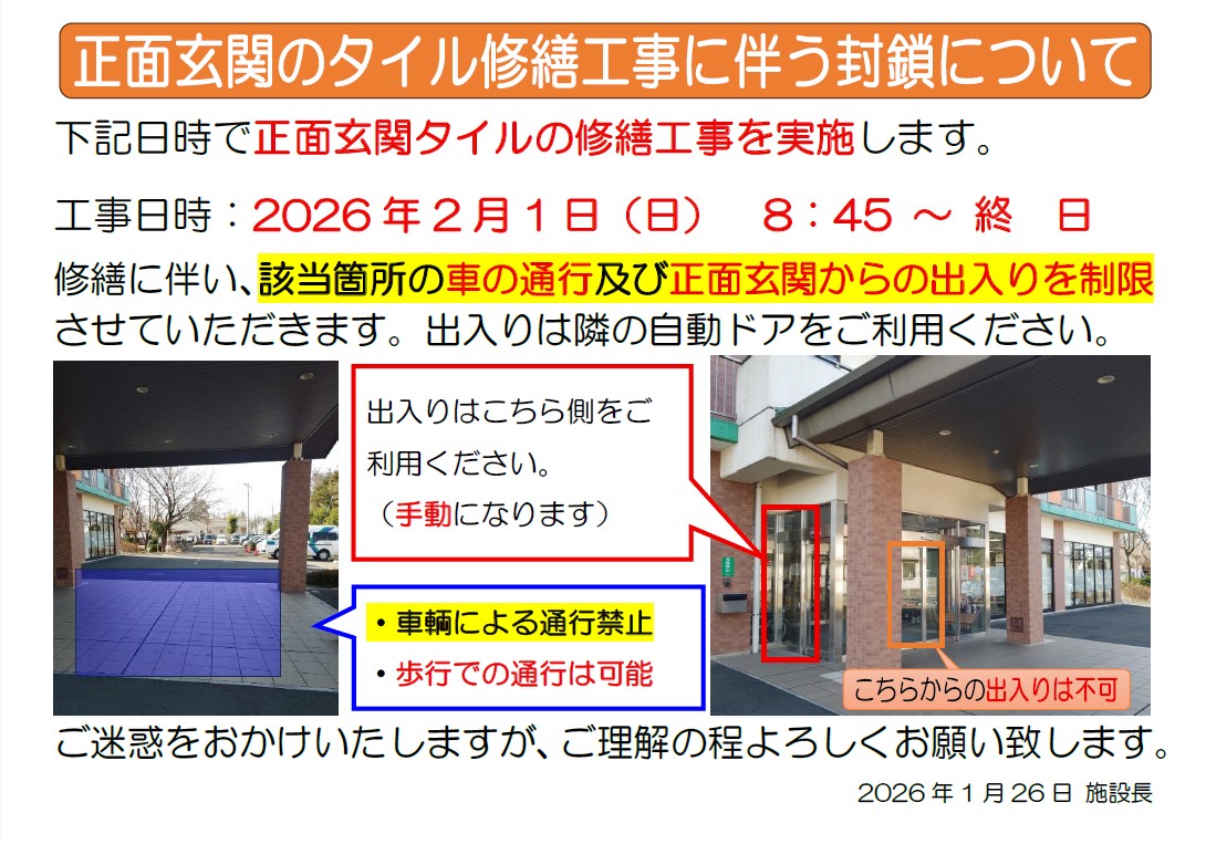 正面玄関タイル修繕工事に伴う制限について(2月1日)