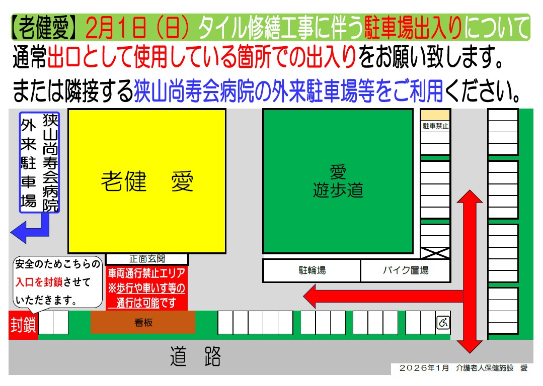 工事に伴い、駐車場の入口を封鎖するため、通常出口として利用している場所からの出入りをお願い致します。また、施設内に出入りの際も正面玄関ではなく、隣にある出入り口からの出入りをお願い致します。